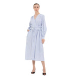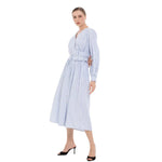 Zarif inci kemer detayıyla öne çıkan bu elbise, sade şıklığı sofistike bir dokunuşla tamamlar. Özel günler ve davetler için ideal bir parça.