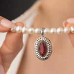 Ticsbrands güvencesiyle size sunulan, Pearlora imzalı bu kolye, lüks ve tutkunun en güçlü birleşimidir. Doğal incilerin saf, klasik zarafeti, merkezdeki canlı yakut taşının derin ve göz alıcı kırmızısıyla buluşuyor.