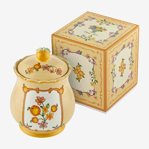 Dekoratif şıklıkla fonksiyonelliği bir araya getiren Chiara Alessi Il Sogno stoneware kapaklı turuncu kavanoz, mutfaklarınıza estetik bir dokunuş katıyor. Çiçek ve meyve motifleriyle öne çıkan bu özel parça, şekerlik ya da küçük atıştırmalıkları saklamak için kullanılabilir. Aynı zamanda dekoratif amaçla da tercih edilebilir.