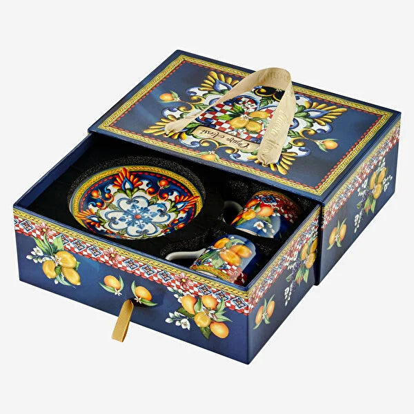 Chiara Alessi Capri ile çiçek bahçeleri sofralarınıza geliyor. Mavi üzerine çiçek ve limon desenleri ile kendisine hayran bırakacak porselen kahve fincan setini çok seveceksiniz.